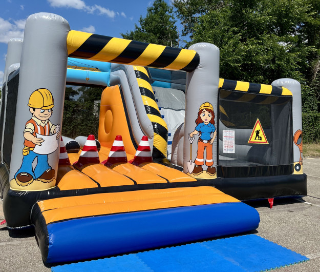 Le complexe travaux est une grande structure gonflable sur le thème du chantier et des travaux. Il permet aux enfants de s'amuser, grimper et glisser parmi les panneaux de chantier . Par sa grande taille, le visuel est très impressionnant et il se repère de loin. Idéal pour une porte ouverte d'artisans ou d'industrie.