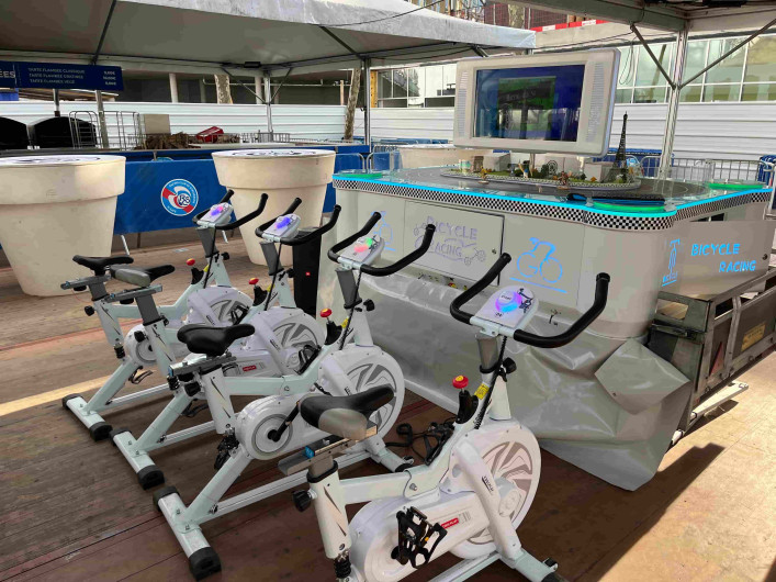 Le vélodrome est une animation sportive et interactive qui transforme votre événement en véritable course cycliste. Les participants montent sur des vélos fixes et doivent pédaler pour faire avancer leur cycliste sur la piste centrale. Plus ils pédalent vite, plus leur personnage progresse sur le circuit, créant une course en direct très visuelle et particulièrement amusante pour les joueurs comme pour les spectateurs. Grâce à son écran de visualisation et à son principe simple à comprendre, cette animation attire immédiatement l’attention et crée une ambiance dynamique autour du défi.