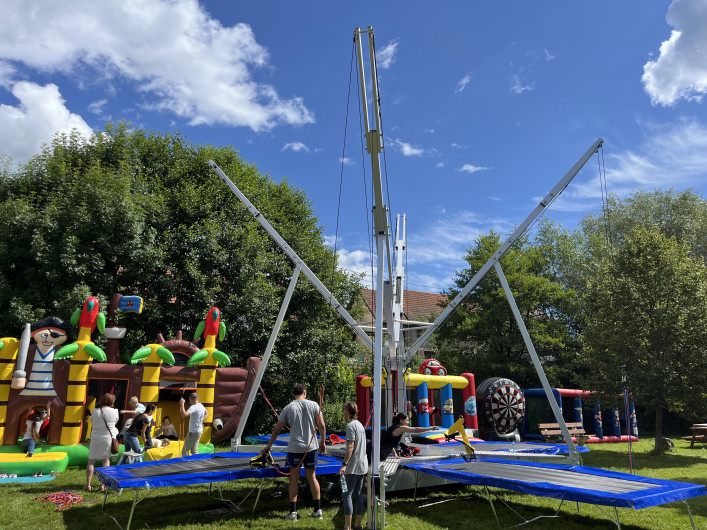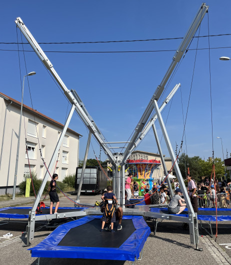 Envie de faire sensation lors de votre prochain événement à Haguenau ou dans le Bas-Rhin ? Ce trampoline élastique 4 pistes est l'animation qu’il vous faut ! Grâce à ses harnais reliés à des élastiques ultra-résistants, les participants peuvent bondir en toute sécurité jusqu’à 6 mètres de haut. Frissons garantis !